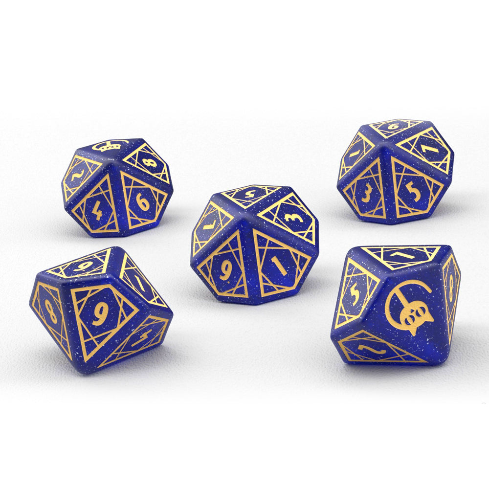 A set of 5 high-quality sparkly blue dice made of durable acrylic, perfect to play Cats!: The Conspurracy.
