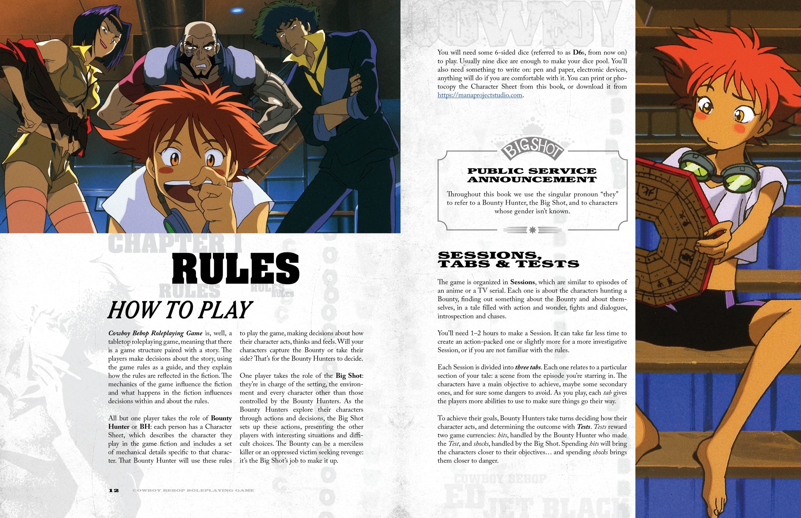 Not enough for you? Inside the book you will also find the character sheets of our Bebop favorites. Play as Spike, Faye and even Ein, or, if you prefer, create your unique character in the Cowboy Bebop universe.