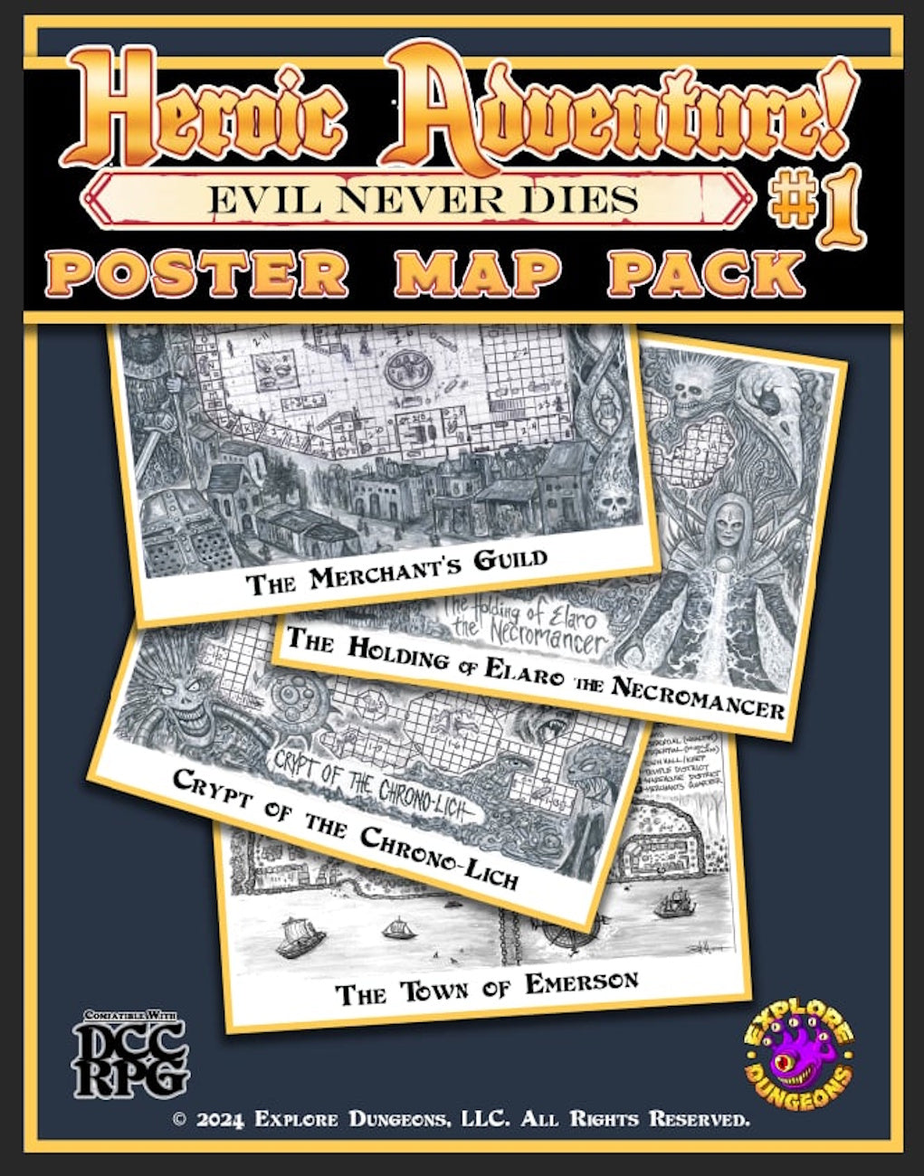 For use with Heroic Adventure! #1 - Evil Never Dies. This pack contains four 24" x 36" poster maps suitable for game play or displaying in your game room. Includes: Crypt of the Chrono-Lixh, The Holding of Elaro Milner, The Merchants Guild, and The Town of Emerson.