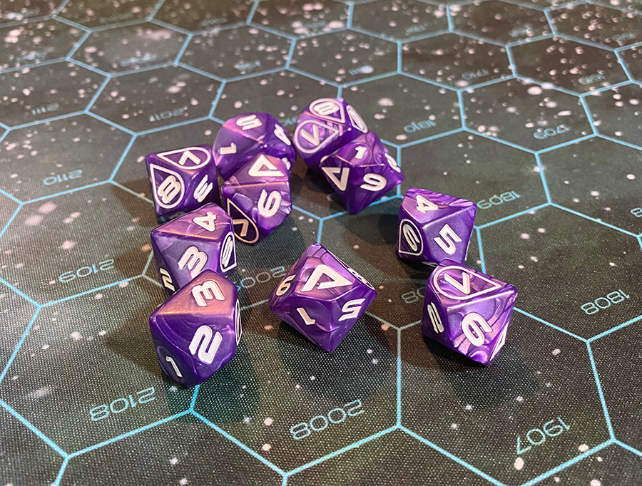 The Callistonian Empire Dice set contains 10 d10 Aetherstream dice. They are pearlescent Purple with white numerals. Faces 7 through 9 include a teardrop outline and the 10 face is the Aetherstream "A." All indicating normal target number successes.