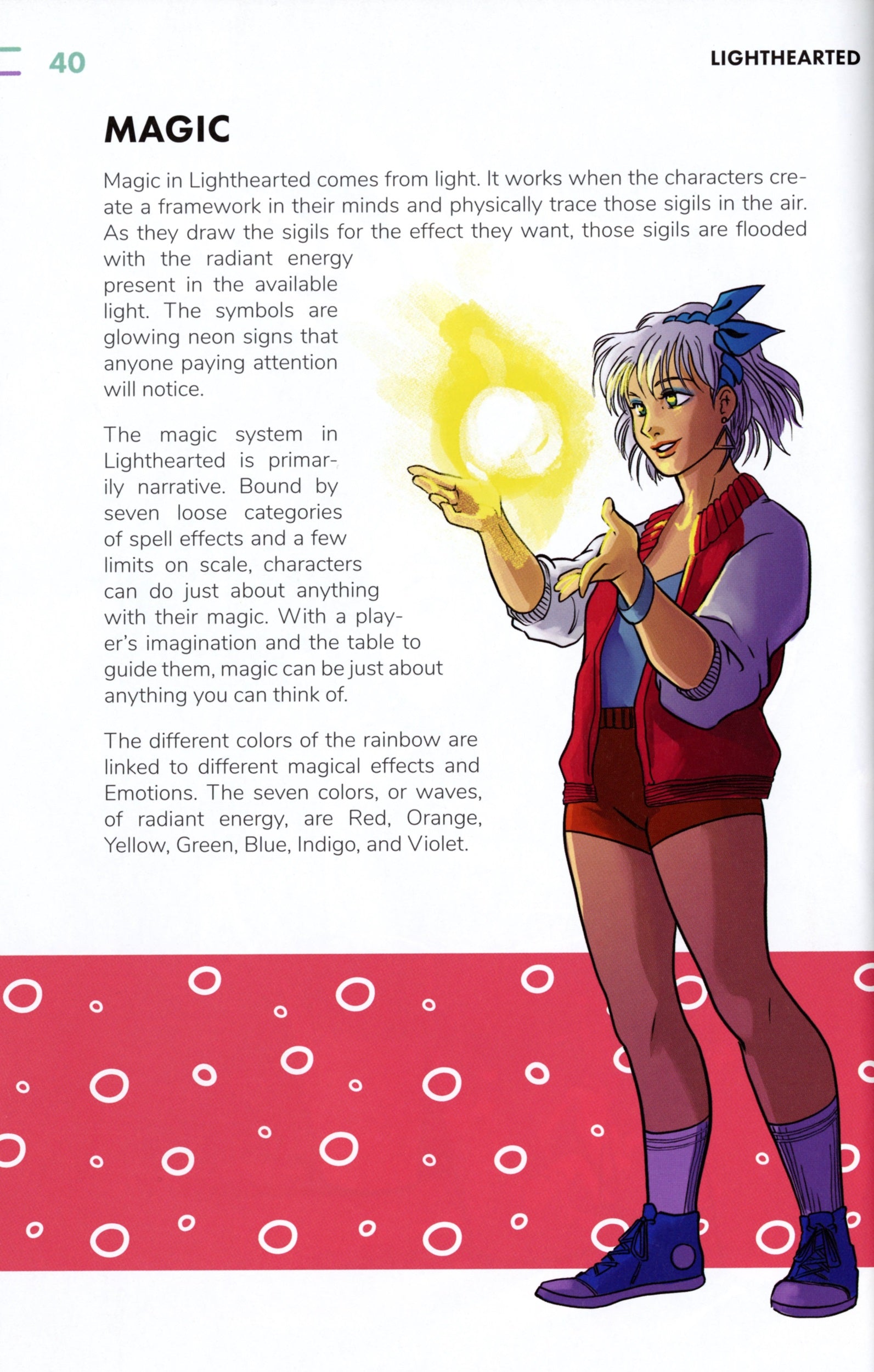 - A narrative magic system that blends neon rainbow magic with the character's emotions
