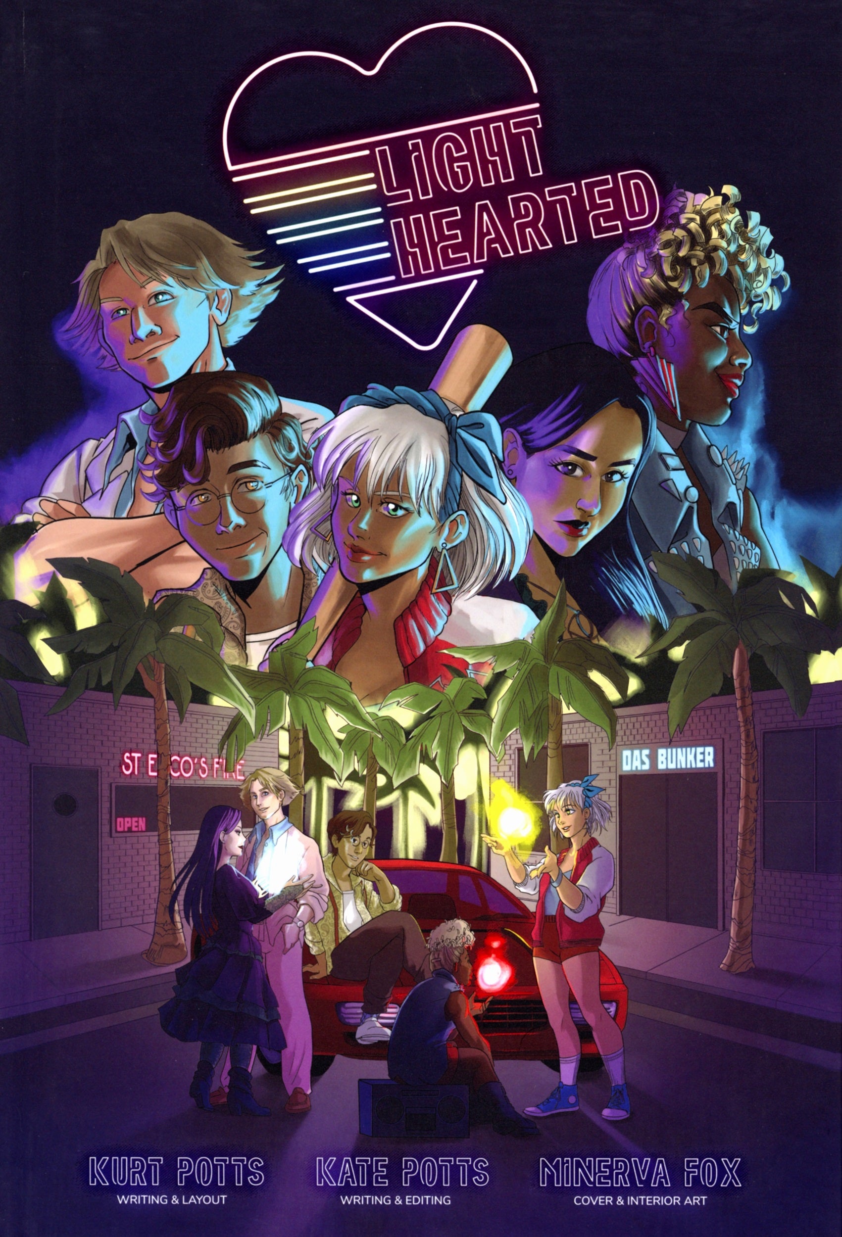 Lighthearted is a complete tabletop roleplaying game that uses the language of film and television to reimagine the coming of age stories popular in 80s teen movies like Weird Science and Sixteen Candles, but with a modern fantasy spin. It's set in an alternate 1980s with fantasy elements weaved into the most outlandish bits of 80’s pop culture. There are fantasy religions mixed in with mall culture, dark magic cold wars, and magical glamours instead of plastic surgery.