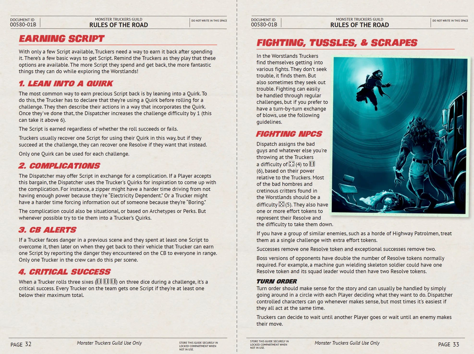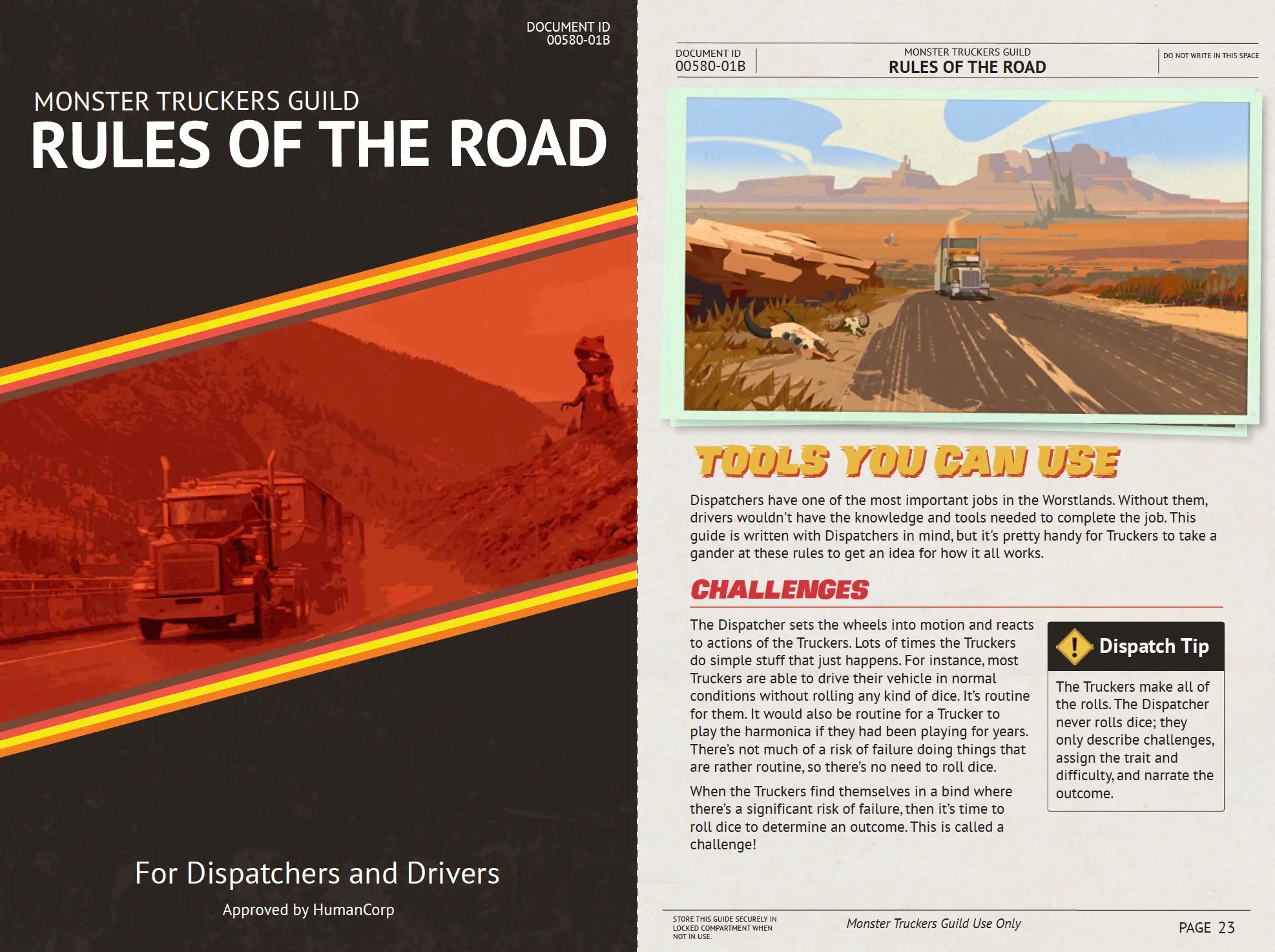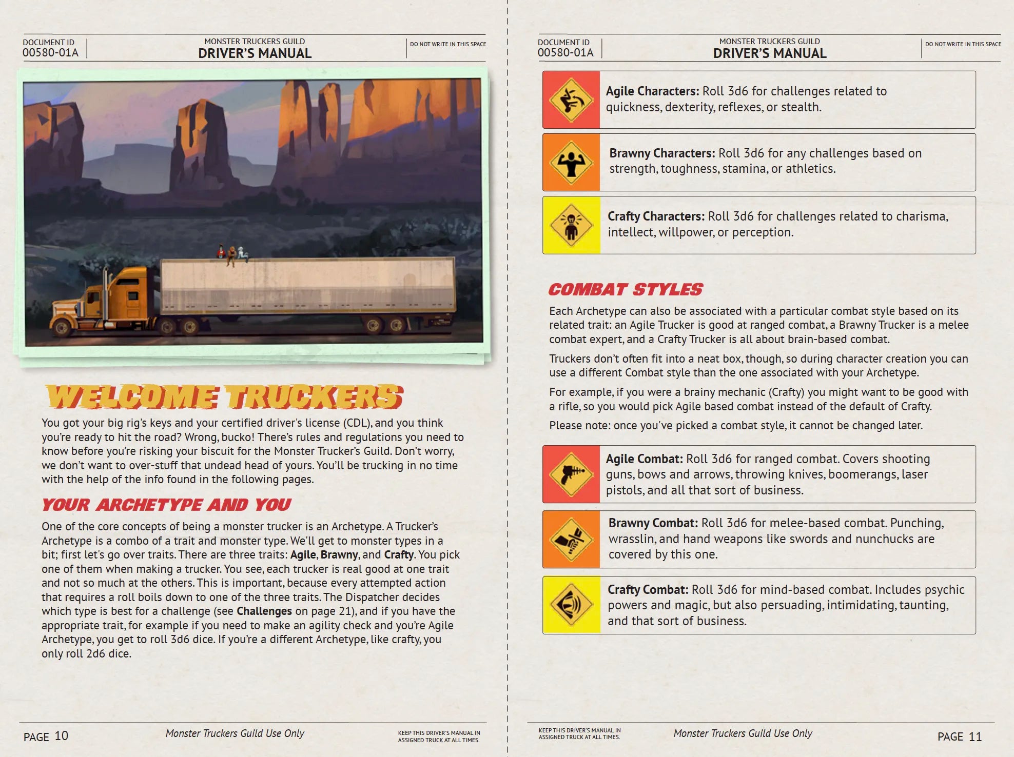 Monster Truckers features lightweight and easy to run game mechanics using Tri-Cube Tales from Zadmar games. Players roll 1-3 six-sided dice (depending on their archetype) against a difficulty of 4-6 (depending on the situation). They need to succeed with at least one die. Perks can be used to reduce the difficulty, while quirks can increase it. Players use "Script" tokens to power their Perks and they can increase difficulty to earn Script back. This simple set of core mechanics are used for everything, including combat. Players explore the world of Monster Truckers and get into some pretty wild and exciting shenanigans thanks to the rules which allow for a lot of freedom and over the top fun. It's Time to Hit the Road Start up your big rig, honk the air horn, and journey across the Worstlands to deliver your cargo!