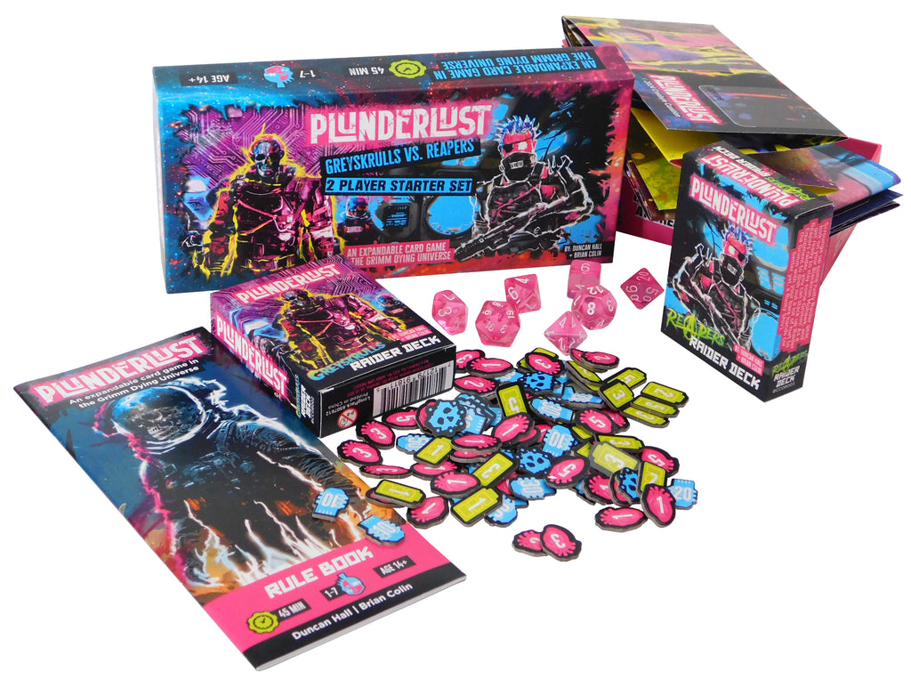 In Plunderlust, each player takes on the role of a scrappy plunderer and their crew of gruesome Space Raiders salvaging whatever they can from derelict space stations and starships. Earning creds to buy gear will ensure they live a little longer when facing the monstrous threats lurking in the Grimm Dying Universe.