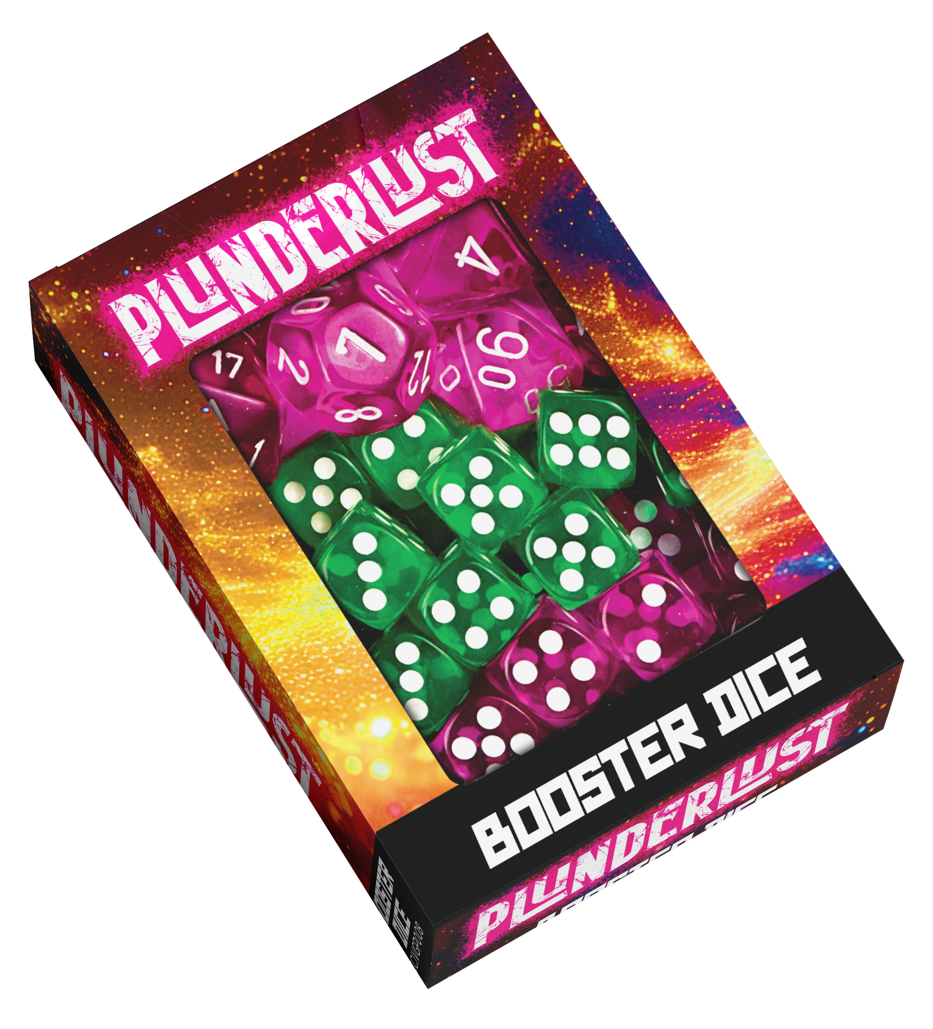 The Plunderlust Booster Dice Set includes: • 7 Piece Polyhedral Dice Set • 24 d6 Magenta HP Counters • 16 d6 Toxic Green Volt Counters.