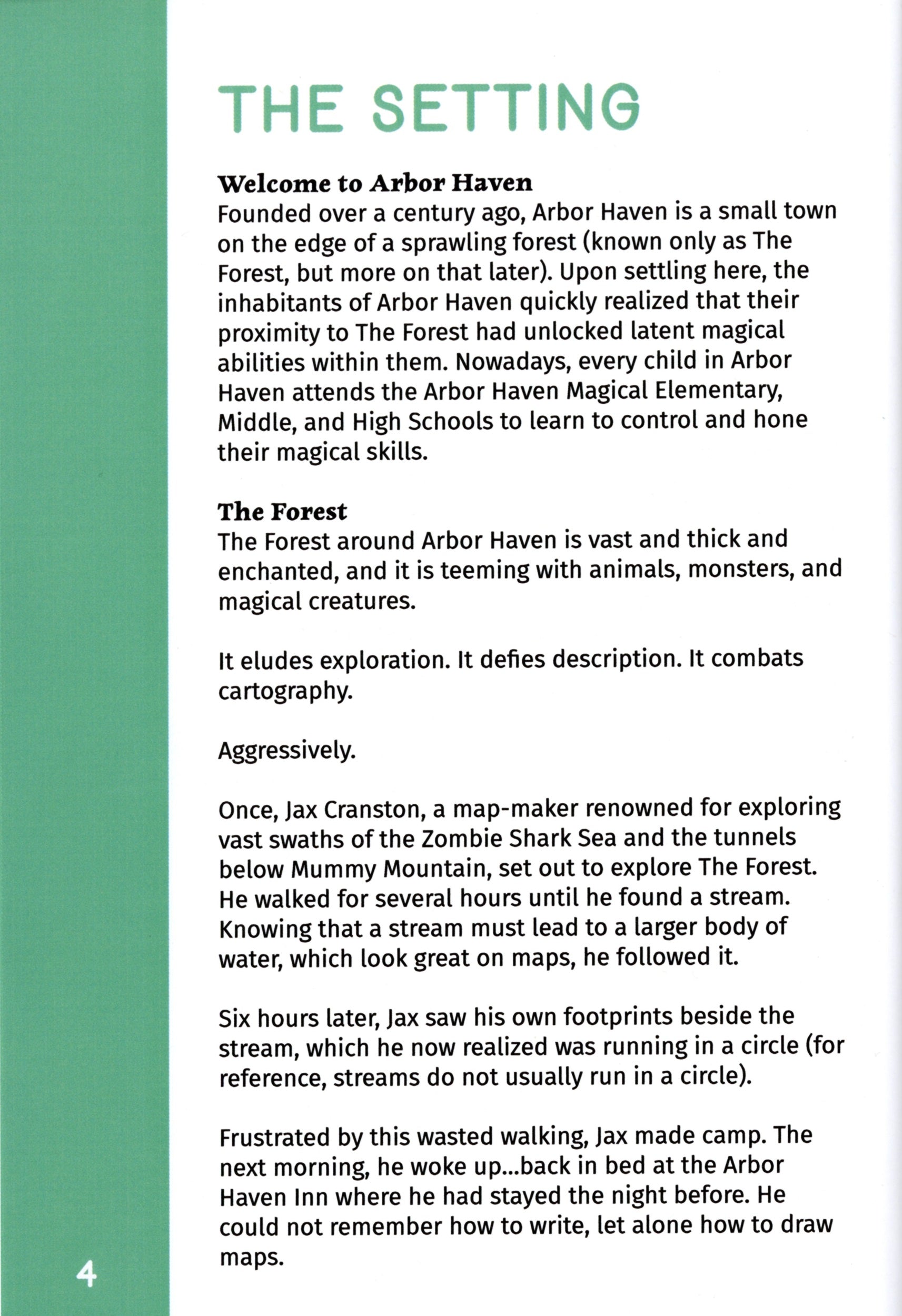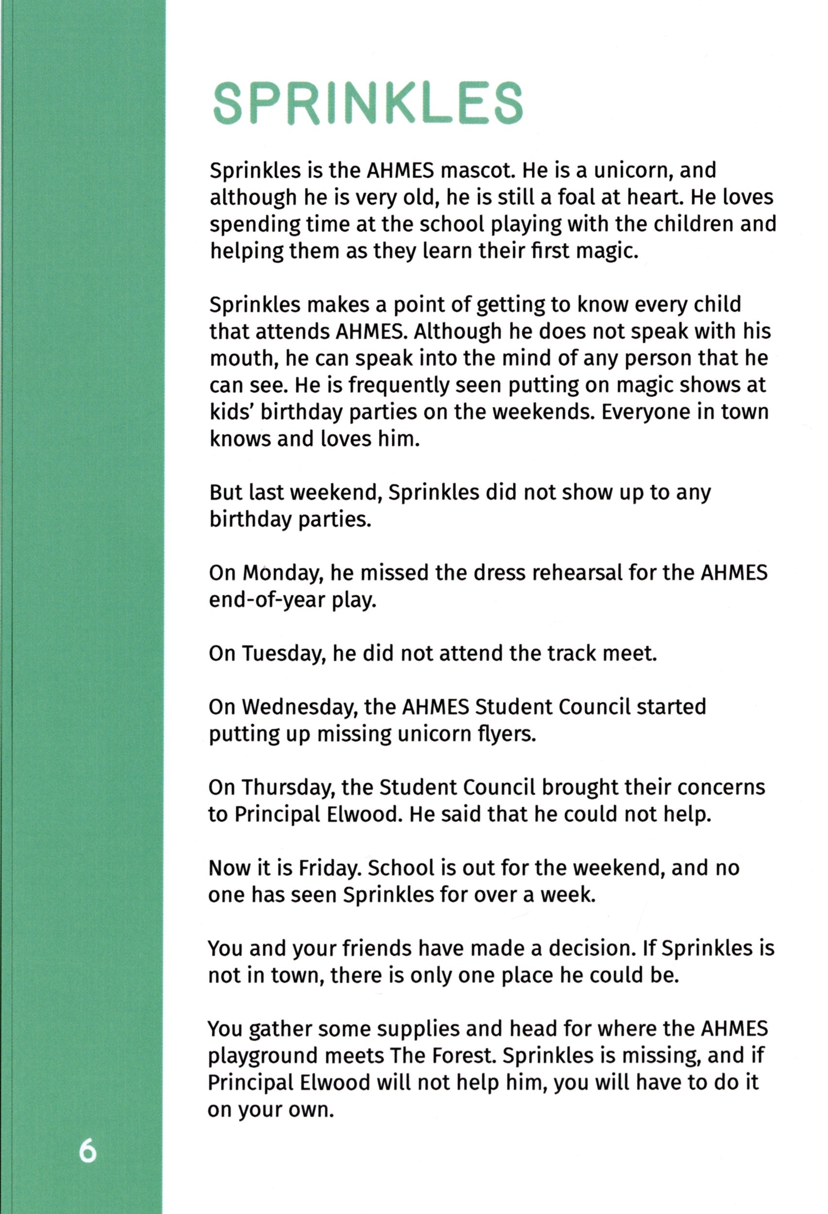Welcome to Arbor Haven, a small town on the edge of an enchanted forest. For the last week, the emelentary school’s mascot, Sprinkes the unicorn, has been missing. Despite the principal’s warnings, you and your friends have decided that the evil wizard Grumpster the Gray has kidnapped Sprinkles. You gather some supplies and head into The Forest to rescue him.