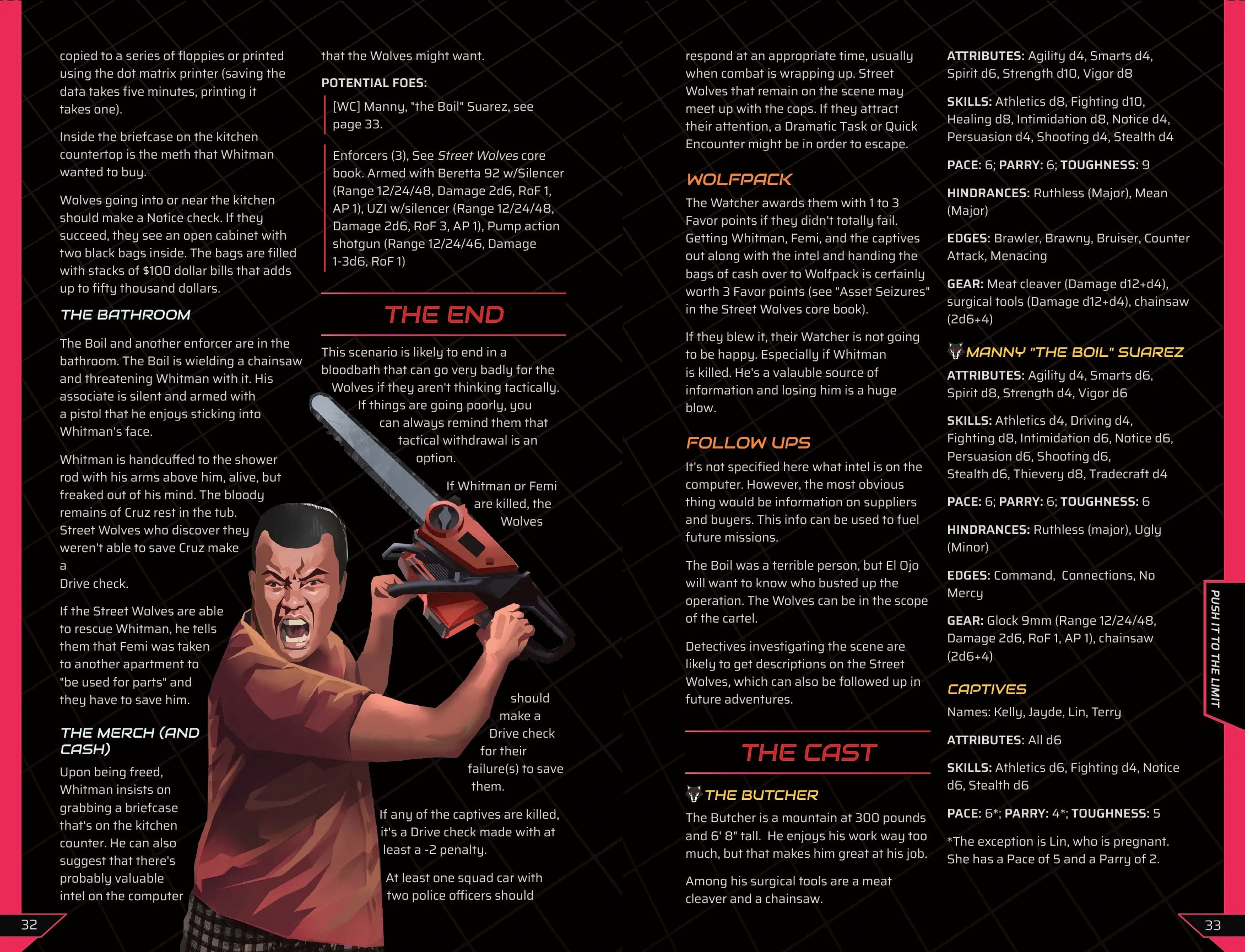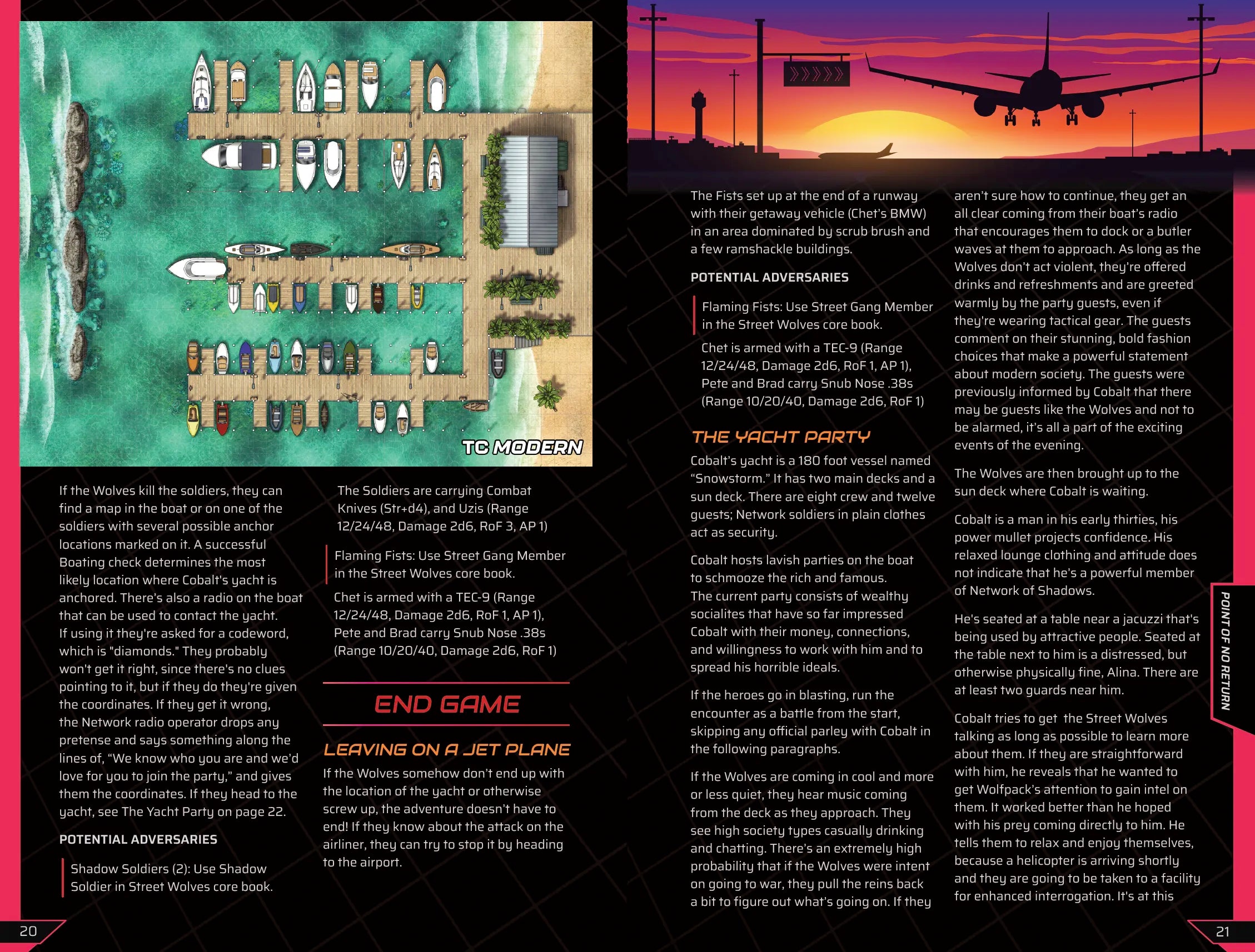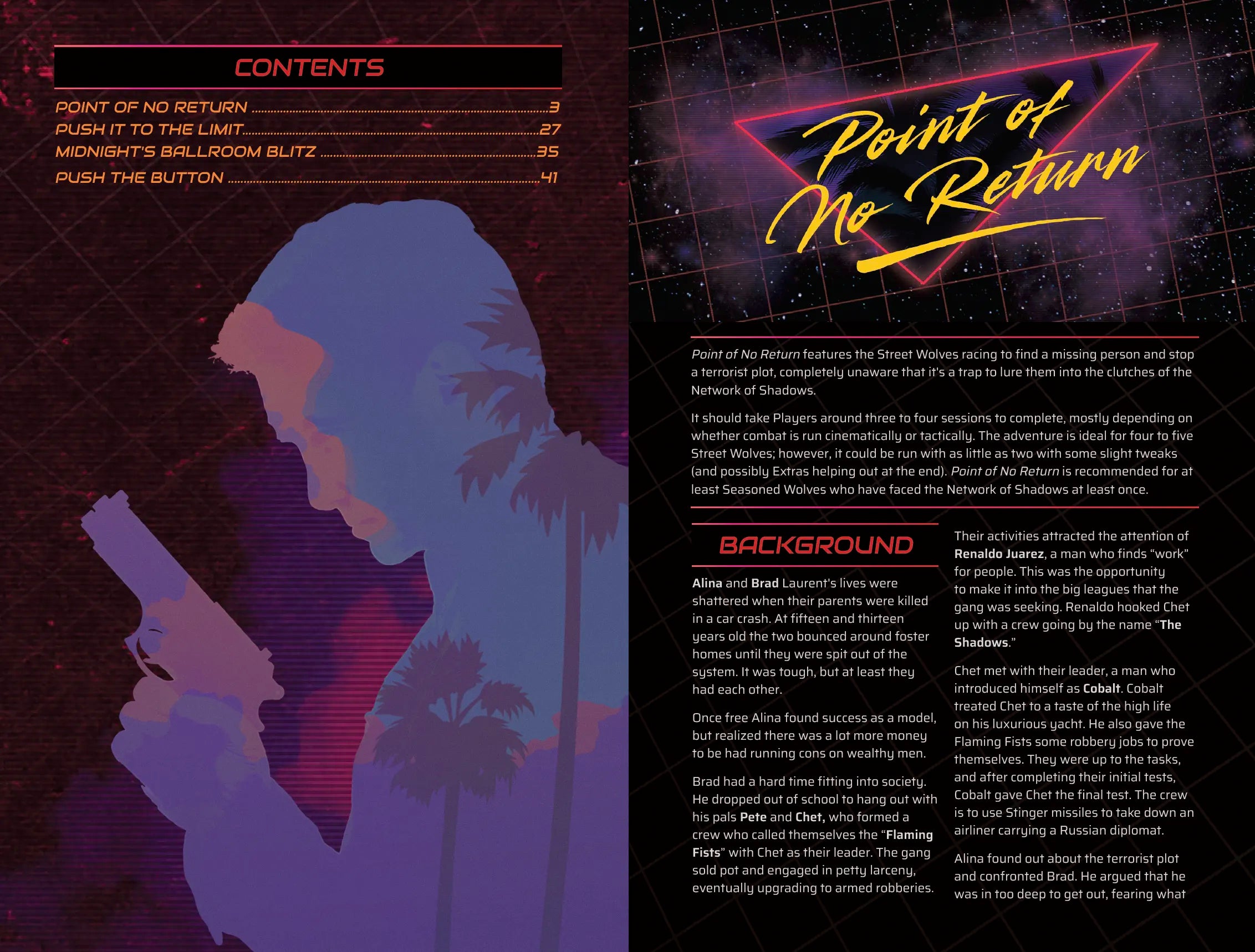 Point of No Return: The Wolves are on the hunt for a missing person who holds the key to unlocking a terrorist plot. As they investigate they encounter crooked cops, shady informants, vicious bikers, and a plot by the evil Network of Shadows. Originally available to a select few Kickstarter backers, this is the Street Wolves adventure that started it all!
