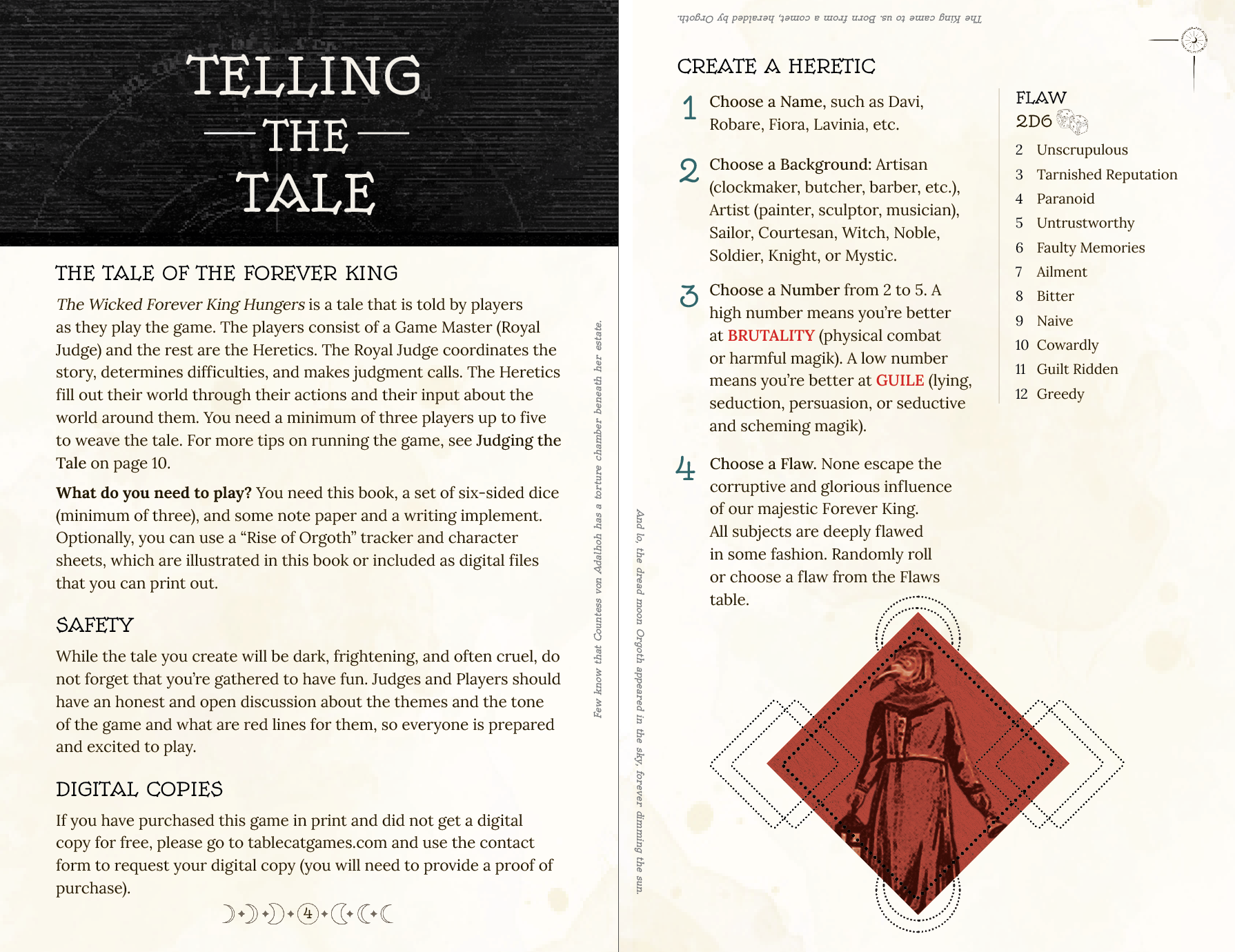 The Wicked Forever King hungers is super quick to learn and easy to run. Its mechanics are based on the Lasers and Feelings rule set with an additional doom clock that counts down the doom that can befall the heretics. Once the pale moon of Orgoth has fully risen, the Forever King is at his greatest power and the game reaches a disastrous conclusion, unless the players can stop him. The game is designed for one shots where the adventures change, but the cycle of the King awakening and attempting to feast is the same.