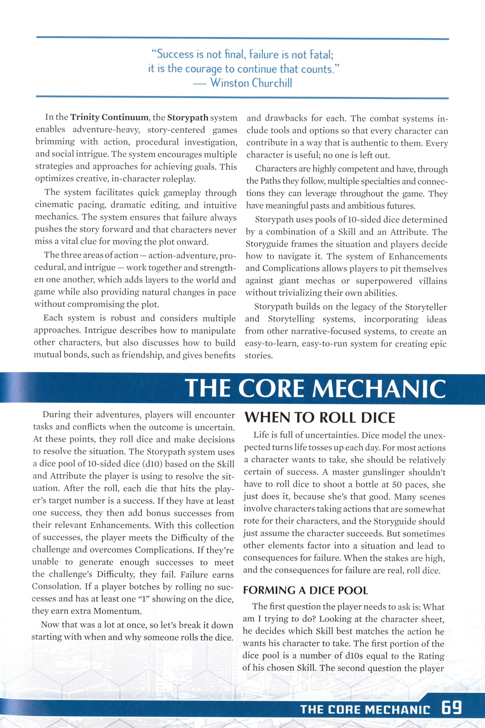 The Trinity Continuum Core rules, which employ the Storypath System, are the foundation for interacting with the Trinity Continuum setting. The Trinity Continuum Core book is a 7-inch by 10-inch hardcover book, approximately 200+ pages, with full-color interiors. Contents include: Chapter One: The World Today; Chapter Two: Base Character Creation; Chapter Three: Storypath System; Chapter Four: Combat and Equipment; Chapter Five: Storyguiding; Chapter Six: Talents; Chapter Seven: Talent Gifts. The Trinity Continuum Core rules provide a contemporary baseline, allowing you to explore modern scenarios in various genres. Present day scenarios involving dedicated investigators, audacious con artists, underground do-gooders, and intrepid explorers can all work within the structure provided. This Trinity corebook is published by Onyx Path Publishing. The Storypath System is a set of rules designed to power Onyx Path-owned gamelines such as the Trinity Continuum and Scion Second Edition.