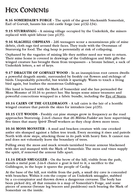 160 pages, fully illustrated, black and white hardback. Includes a hex map of 144 locations & encounters covering the entire isle of Nullona - a cult of statues, a dismembered god, toffs hunting spirits on horseback, a kelpie colossus, the fracking of heaven - amounting to many campaigns worth of dark fantasy adventure.
